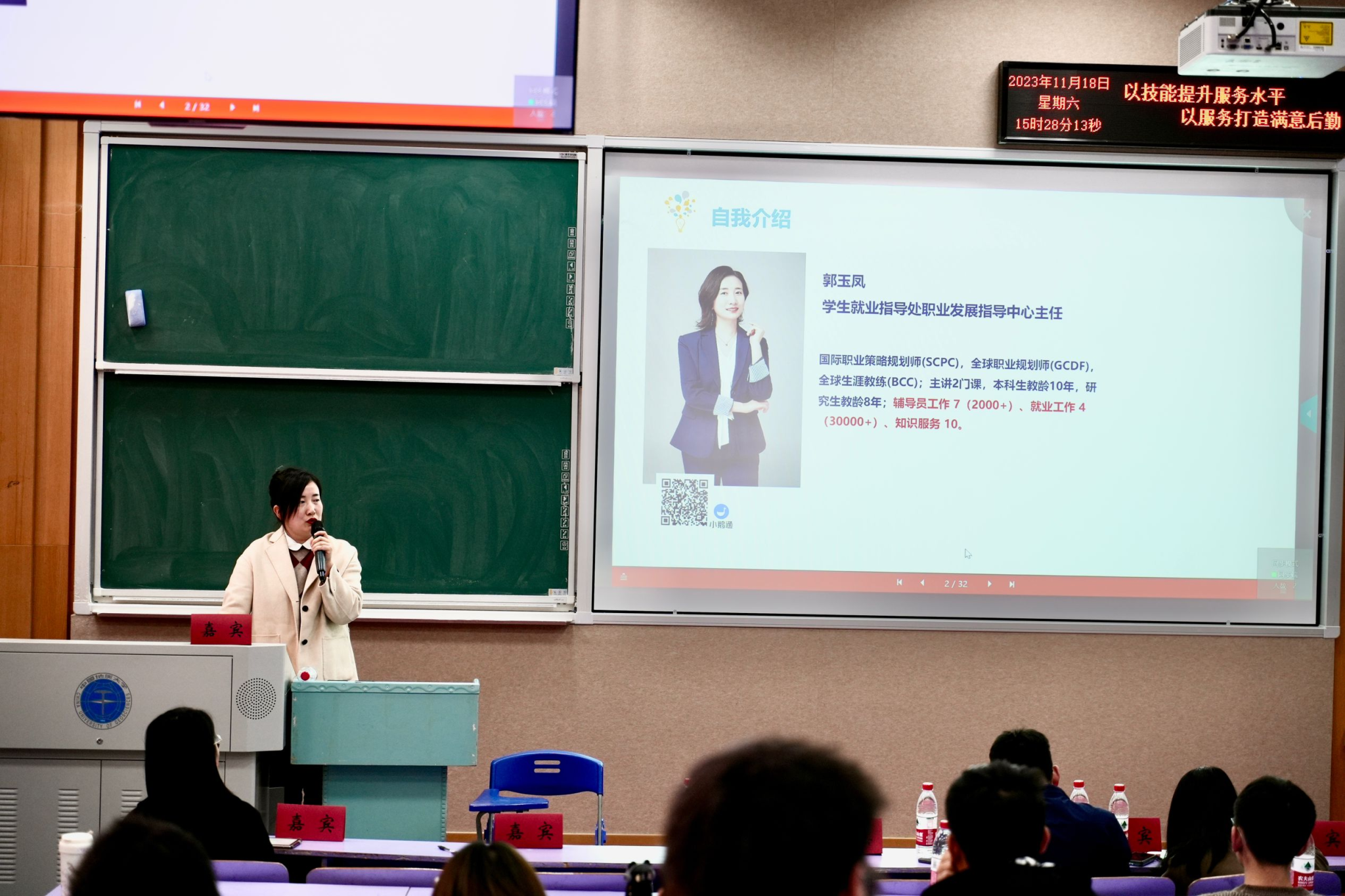 学生就业指导处郭玉凤老师开展了题为《团学活动设计思维力的培养》的专题培训,从思维力的大小、思维力的方向、思维力的作用点三个方面对学生工作进行了指导,帮助学生骨干更好地设计具有创新活力的团学活动。
