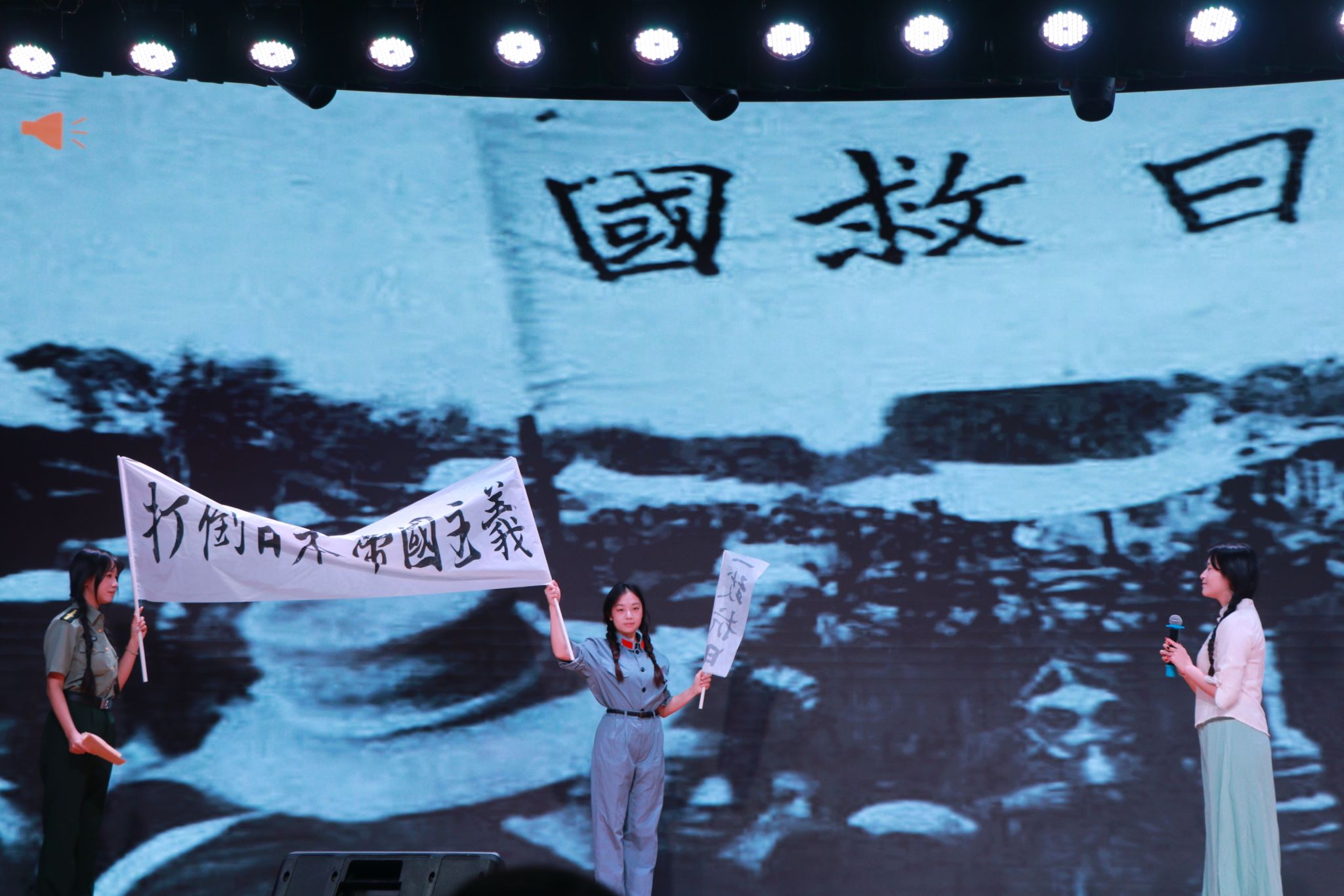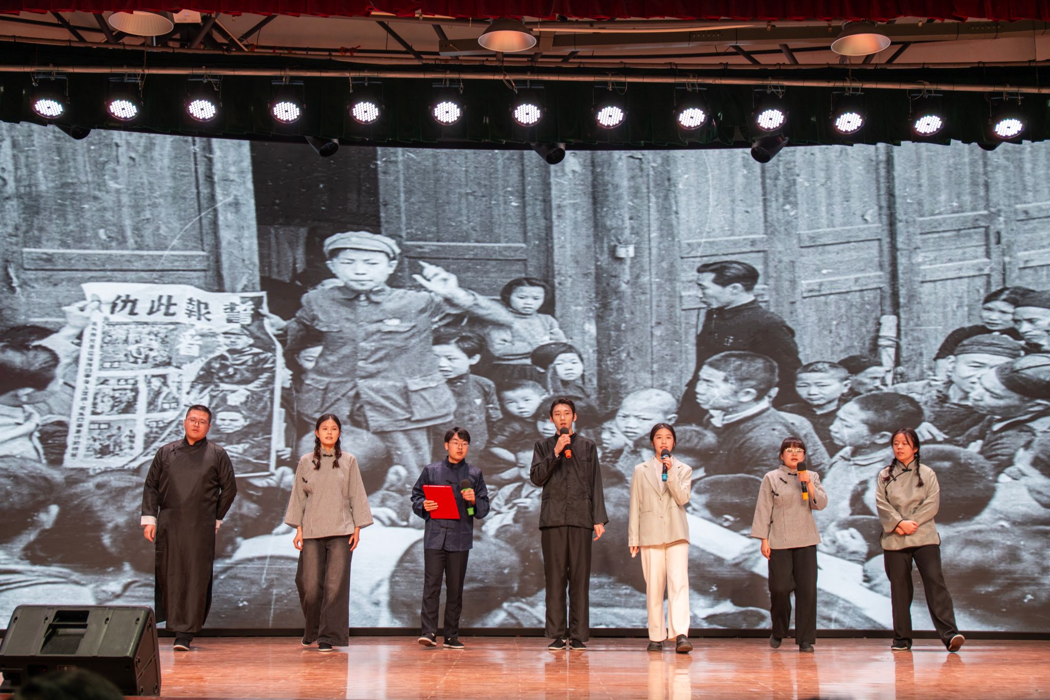 活动以“学习—演绎—思齐”为核心环节,注重青年视角与时代精神的融合。学生团队选取不同领域的先锋人物,通过视频导览、情景再现、感悟分享等形式,将“爱国奉献”“坚守担当”等宏大主题转化为可感可触的舞台故事。从抗疫一线的“硬核守护”到抗战时期的铁血丹心,从音乐战场的时代强音到抗洪前线的英勇献身,不同时代的先锋故事在舞台上交相辉映,共同勾勒出中华民族生生不息的精神脊梁。当舞台上再现抗日英烈林心平在狱中写下“笑汝辈黔驴技穷,甘洒热血化彩虹”的壮烈场景时,许多观众为之动容。这种“以演促学、以情育人”的方式,让先锋精神可感可知,引导当代青年思考如何在自己的岗位上践行责任与使命。