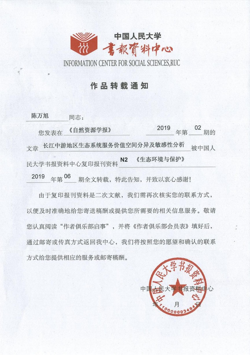 土地资源管理专业博士生陈万旭发表于《自然资源学报》期刊2019年第2期的论文“长江中游地区生态系统服务价值空间分异及敏感性分析”,被中国人民大学书报资料中心复印报刊资料《生态环境与保护》2019年第6期全文转载,通讯作者为李江风教授。