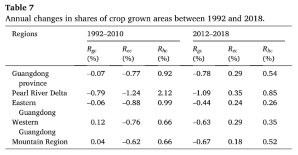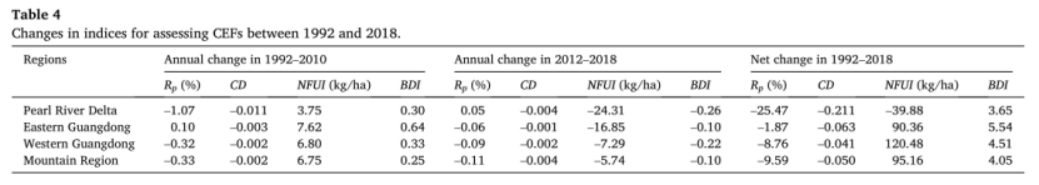 CEFs在省级和区域层面的转折点年份在2010年左右。本文将FTCE分为1992-2010年和2012-2018年两个阶段,并计算FTCE度(TDCEF)。结果表明,TDCEF在省级层面为1.83,区域差异显著。其中珠三角地区TDCEF为4.05,粤东地区次之,粤西地区为1.13,山区为1.07。3.FTEC的基本机制单因素分析和回归模型的结果表明,随着人均GDP的增加,FTCE出现了明显的由快速消费向恢复性增长的转变。气候变化是对CEFs变化影响最大的物理环境因子。但回归结果表明,由于研究周期只有26年,AT和AP两个气候因子对CEFs的变化没有显著影响。因此,人类活动对CLU的影响是导致CEFs变化的主要原因。农民的CLU活动本质上是农业生产替代的结果,是对耕地资源稀缺和农产品市场需求的回应。具体来说,农民倾向于用低成本投入取代高成本投入,用高回报作物取代低回报作物。从指数的变化可以归纳为农业投入替代、作物替代和土地利用替代三个方面的CEF变化机制。