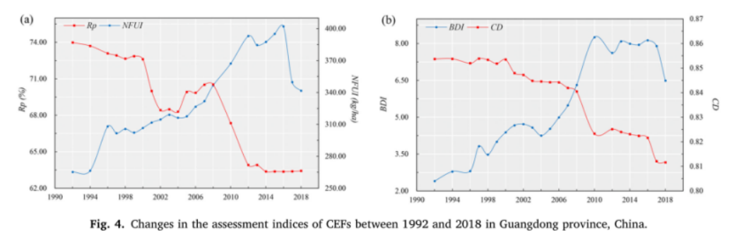 首先,化肥对稀缺耕地的替代导致了CLU生态过程的变化。1992年至2010年,NFUI在省和地区层面迅速增长。值得注意的是,2012年后化肥价格迅速上涨。与此同时,土地成本开始下降。2012-2018年,NFUI在省级和区域层面上开始下降,NFUI的这种变化有助于CLU生态过程的减缓退化甚至恢复增长。其次,作物替代改变了耕地生态系统的复杂结构。1992-2010年间,全省粮食作物和经济作物种植面积占比每年分别减少0.07%和0.77%,而园艺作物种植面积占比每年增加0.92%。2012年以后,全省粮食作物种植面积占耕地面积的比例每年下降0.78%,而经济作物和园艺作物种植面积占耕地面积的比例每年分别增加0.29%和0.54%。1992-2010年和2012-2018年,经济作物种植面积占比由下降转为增加。上述作物替代使CD从快速下降转为相对缓慢下降,有助于减缓栽培生态系统结构水平的退化。最后,旱地改水田改变了耕地生态系统组成水平。广东省的水田主要用于种植水稻,而旱地则用于种植干谷物、马铃薯、大豆以及经济和园艺作物。以经济作物和园艺作物取代粮食作物导致旱地取代水田。因此,Rp在省级和区域层面整体迅速下降。从1992-2010年到2012-2018年,大米利润迅速增长。在1992-2018年间,Rp由快速下降转变为相对缓慢下降,导致耕地生态系统组分水平退化减缓。上述三个方面的变化也决定了耕地生态系统的可持续性从快速退化到恢复生长的变化。