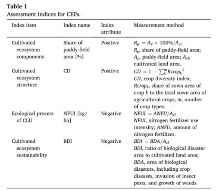 2. CEF评估方法根据CEFs的内涵和理论框架,可以从栽培生态系统的组成、结构和可持续性以及CLU的生态过程三个方面对CEFs进行评估。稻田面积份额(Rp)可以作为衡量区域内栽培生态系统组成水平的关键指标。以作物播种面积为基础的CD可以用来衡量一个区域内的栽培生态系统结构。氮肥使用强度(NFUI)是显著影响耕地生态系统生物物理化学过程的典型和主要因素。因此,NFUI可作为影响CLU生态过程的关键指标。生物灾害烈度(BDI)是衡量耕地生态系统可持续性的关键指标。BDI越高,耕地生态系统可持续性损失越大,CEFs越低。
