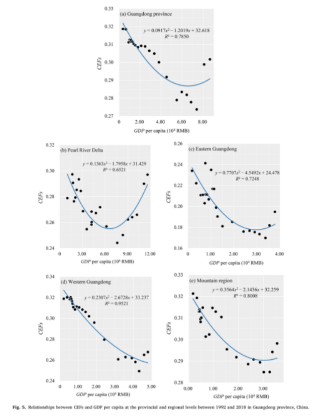 2.FTCE的u型曲线与测度通过计算1992年至2018年之间的CEFs值,并模拟人均GDP与CEFs之间的关系,可以看出,无论是省级还是区域,人均GDP与环境融资的关系都呈现u型曲线的共同特征。