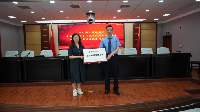 与天门市人民检察院进行了法学教育实践基地挂牌仪式。曾志军检察长和才惠莲副院长签订了《结对共建协议书》,共同为法学教育实践基地正式揭牌。