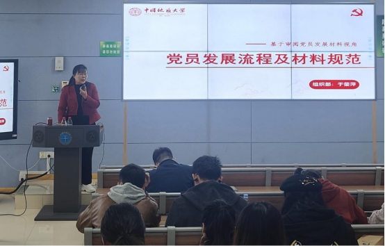 随后,党委组织部专职组织员于荣萍进行《党员发展流程及材料规范》培训。于老师结合《中国共产党发展党员工作细则》规定和具体案例,详细介绍了党员发展的组织流程和党员发展过程的材料规范。培训过程中各B体育