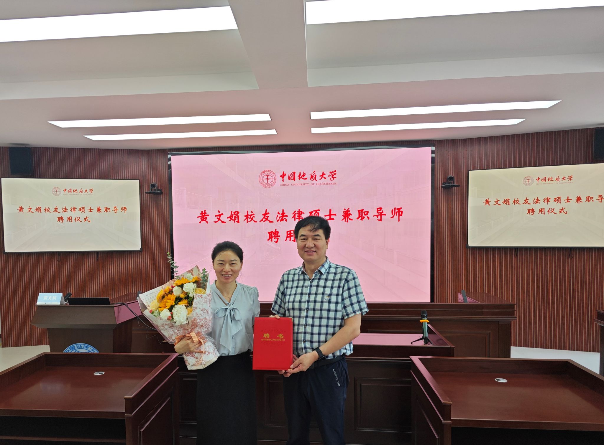 党委书记张宽裕为黄文娟校友颁发法律硕士兼职导师聘书。