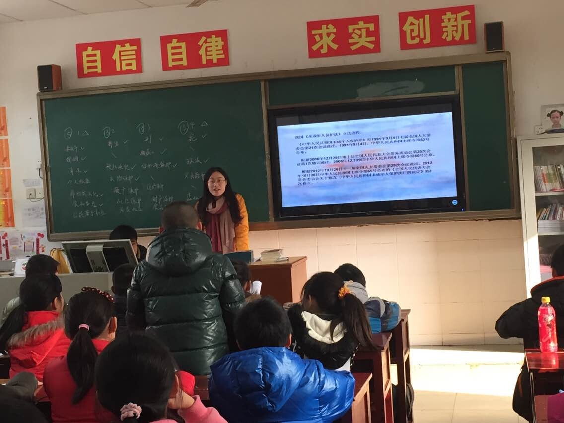 团队8名成员精心筹备了半个月,通过灵活多样的形式、通俗易懂的语言向小学生们生动地讲解了与未成年人保护息息相关的法律知识。40分钟的课堂分为“法律是什么”、“法律在身边”、“法律知多少”、“法律伴我行”四个环节,通过提问、观看视频、情景剧表演、师生互动以及课程小结来组织教学。首先以“大家都知道哪些法律”这一问题将学生带入课堂。同学们年龄虽小但是有一定的法律基础,回答出来了数十种法律名称。不过奇怪的答案也是层出不穷,比如“预防犯罪保护法”、“公民基本权益保护法”等,类似的答案引起全班哄堂大笑。数轮回答之后,法律硕士研究生张静向大家解释了法律是什么以及未成年人保护法的主要内容。