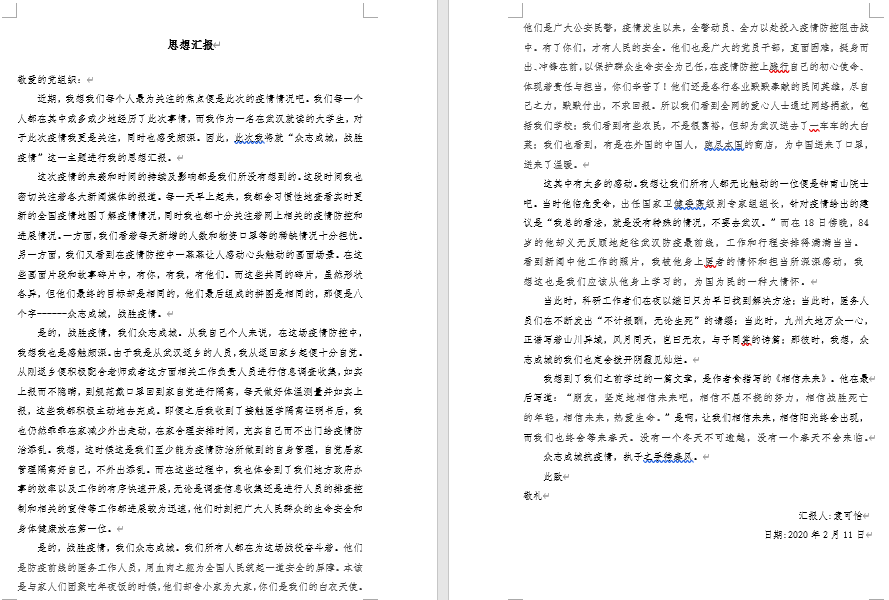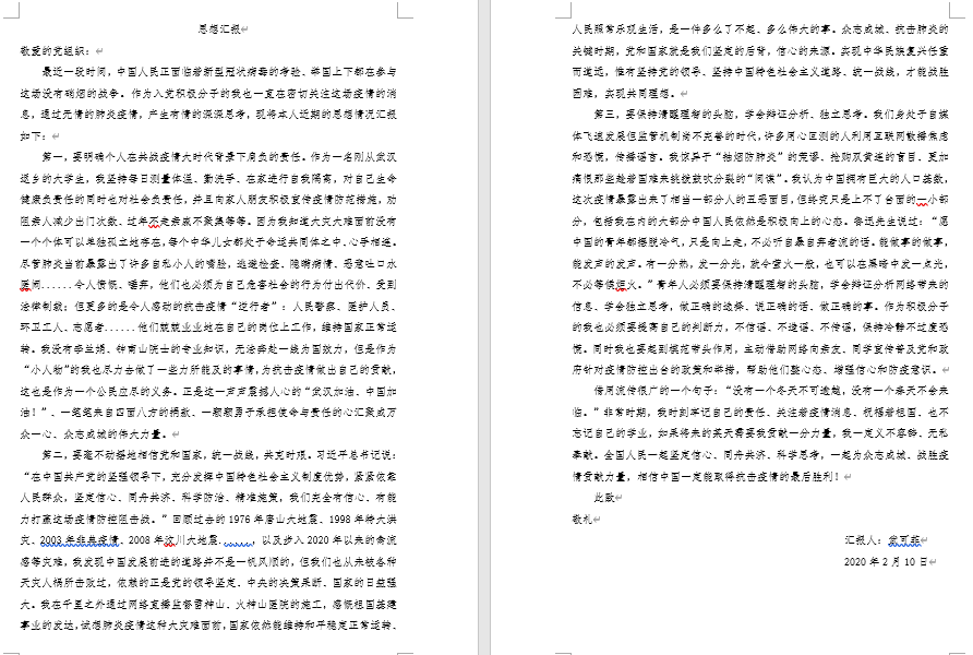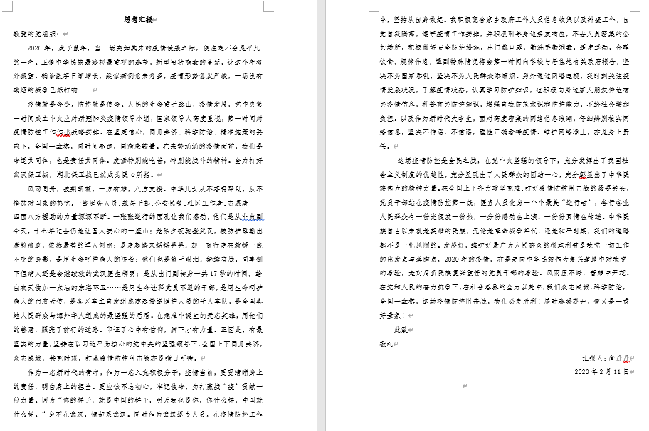党委号召广大学生党员认真撰写“众志成城 战胜疫情“专题思想汇报,向党组织报告自己成长学习状态。支部全体成员积极响应、主动参与,共提交专题思想汇报79份,思想汇报立场坚定、内容充实,情感真挚,体现出支部广大成员对于疫情防控的全心关注,对党中央及各级党委政府要求部署的认真学习,对于坚决打赢疫情防控阻击战的坚定信心。