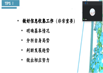 作为李四光计划入选者,马伟蕊学姐从专业学习角度出发,讲述了专业课学习和英语学习两方面的心得经验,同时也讲述了自己的科研方面的收获和体会,,丰富的科研经历及收获也让大家更加明确了本科阶段参加科研项目的重要性。最后她从夏令营、预推免方面分享保研经验。她建议学弟学妹们打好专业课基础,培养好的学习习惯,提前发现自己兴趣爱好深入钻研,为未来做好打算,并送上“一切终将暗淡,只有你,才是光芒”真挚的祝福。