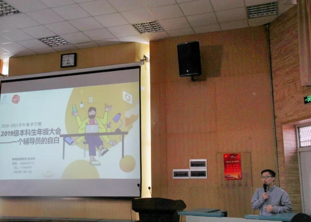 接下来,刘国华书记总结了前面两位老师的发言,向大家介绍了学工组团队的组成情况。他表示老师们会尽自己最大的努力为同学们的学习和全面成长成才提供帮助,然后以“惜时,律己,静心”为主题讲话。他多次强调了考风考纪的重要性,指出目前存在部分寝室卫生不达标、有同学上课睡觉等问题。他提醒同学们,大学学习必须要有较强的自律性和自主性,只有守纪律、正学风、负责任、讲效率,才能成为有担当的新时代新青年。
