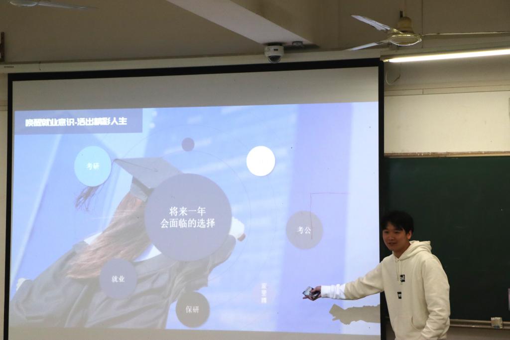 接下来,2017级公共事业管理专业云龙学长(学生工作及实习实践经验丰富,综合素养优秀)以《唤醒就业意识,活出精彩人生》为主题,幽默风趣地为大家分享了自己的成长经验及生涯发展知识。他从认识自己、认识行业、认识职业类型等5个方面为大家分享了自己对于生涯规划和职业发展方面的理解。分享最后,他告诉大家“人生会有千百种可能行,我们可以不断复盘,去寻找人生更好的答案”。