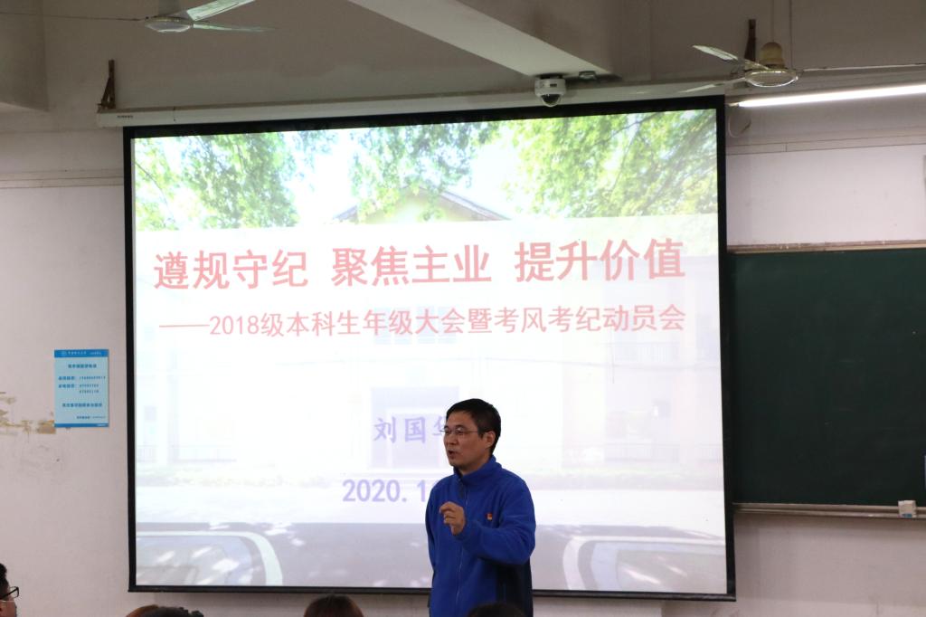 党委副书记刘国华老师、年级辅导员吴波老师、2017级优秀本科生代表殷瑞敏、张馨月、云龙三名同学及2018级全体本科生参加此次大会。大会由吴波老师主持。