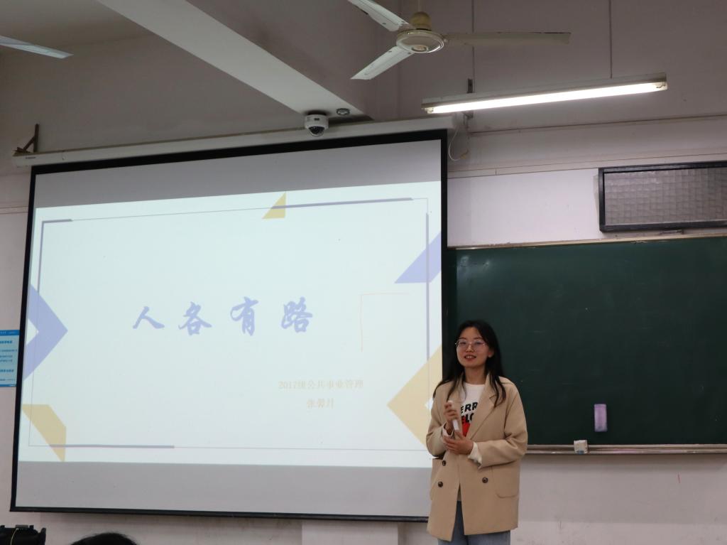 随后,2017级公共事业管理专业张馨月学姐(顺利入选共青团中央第23届研究生支教团计划)以《人各有路》为主题分享了自己的大学成长心得。她从“平台 格局 思想”三个关键词出发,介绍了自己大学期间的学生工作经历和获奖情况,并结合自己的经历告诉学弟学妹们要时刻奋斗,不轻言放弃。最后,她希望学弟学妹们踏踏实实做事,开开心心做人,也祝福大家都能走出独属自己的精彩人生之路。