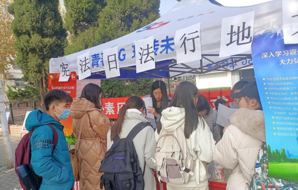 、校团委在东区综合楼AB一楼中庭共同布置了以“弘扬宪法精神,建设法治校园”为主题的4个主题24块宣传展板,展板共分为“习近平法治思想”“弘扬宪法精神,维护宪法权威”“学号用好民法典,做知法守法好公民”“依法治校”;制作500份普法宣传册面向师生发放,进一步增强了师生法治意识。