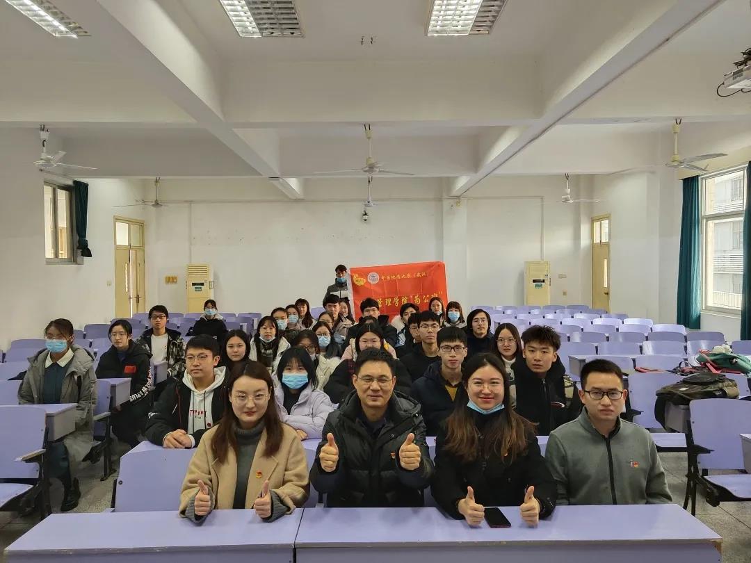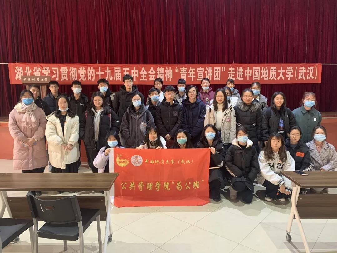 典礼议程进行到了最后一项,“为公班”的同学们集体参与了湖北省学习贯彻党的第十九届五中全会精神“青年宣讲团”走进中国地质大学(武汉)的理论学习活动。主讲人范佳欣老师从契合自身海军专业的角度出发,向同学们介绍了十九届五中全会的概况,随之他提出强军的观点,带领大家观看了有关我国海军的视频,从多个角度讲述了我国海军的历史、现状、成就。范佳欣老师还就青年人建功立业的机会在哪里的问题作出了解答,希望同学们做到站稳人民立场练就过硬本领,投身强国伟业。理论学习结束后,同学们在前台合影留念。