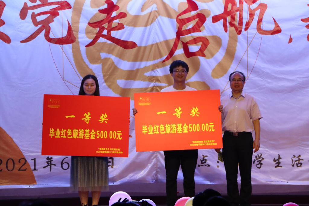 党委书记张吉军上台抽取一等奖。一等奖设置2项,均为毕业红色旅游基金500元。一等奖奖项设置响应建党100周年献礼及党史学习要求,为获奖同学提供红色旅游基金,将党史学习与毕业教育相结合,鼓励毕业生同学在实践中学习党史,在红色旅行中感悟党的百年辉煌征程。