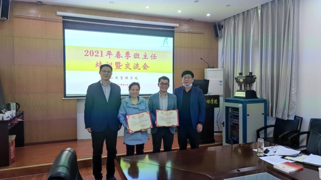 会议第三项,工作经验交流。班主任代表周学武、杨剩富交流了工作体会,分享了与学生相处和班级管理的经验方法。党委副书记刘国华、土地资源管理系党支部书记周学武为获得2020年学校优秀班主任刘中兰、杨剩富老师颁发证书。
