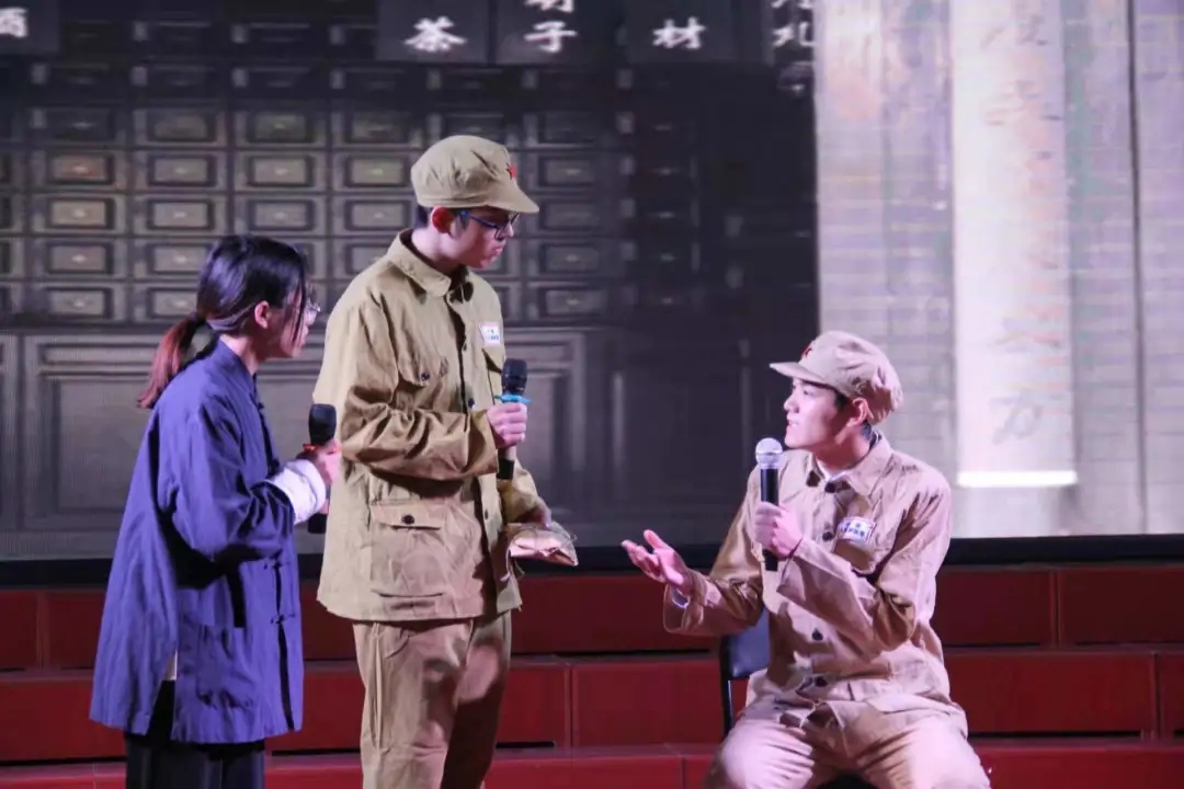紧接着发际线和我作队团队成员以现代青年与竺可桢先生三问三答向我们揭示了先生在取得卓越成就背后所经历的困难与曲折以及在此过程中始终秉持的求是力行的执著精神。其后,社会主义接班人队则生动形象地演绎了陈毅元帅巧妙利用围棋实现了中日两国邦交正常化的事迹,突出“围棋之交”不可磨灭的贡献,赞颂了先辈们的杰出智慧以及为国为民的高贵品质。