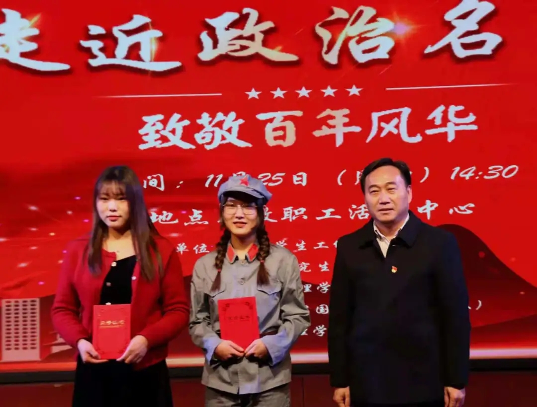 党委书记张宽裕老师做点评。他指出此次“走近政治名家”决赛活动不仅是一次洗涤心灵的党史学习教育活动,也是一场党史学习成果展示活动,对引导激励青年学子学习先锋榜样,凝聚奋斗力量具有重要意义。决赛中各团队对所选人物的理解精准深刻,团队展演既有历史场景的还原,也有跨越时空的对话;既有古今人物精神品格的展示,也有立足时代发出的青春号召,在多样的演绎形式中让师生有了沉浸式的学习体验。