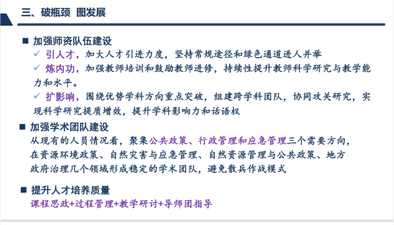 李晓玉老师是地大行政管理专业进入招生目录后的第一届学生。她说,行政管理专业见证了我的成长,我也是行政管理专业成长的亲历者。现在行政管理专业发展前进的责任压在了我们这一代人身上,我站出来不仅是因为有勇气,更重要的是对行政管理专业的感情。她用12个字描述了自己做系主任的工作思路,借东风、破瓶颈、练内功、谋发展,会坚定地团结全系老师一起把系里建设带上新的水平。