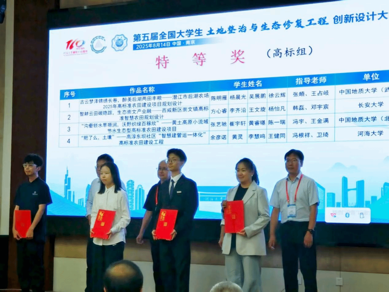 本科生组成的沃土先锋队完成的作品《古云梦泽锦绣长卷,醉美后湖两田丰粮——潜江市后湖农场2025年高标准农田建设项目规划设计》荣获大赛特等奖,指导老师张頔老师和王占岐教授获优秀指导教师奖。
