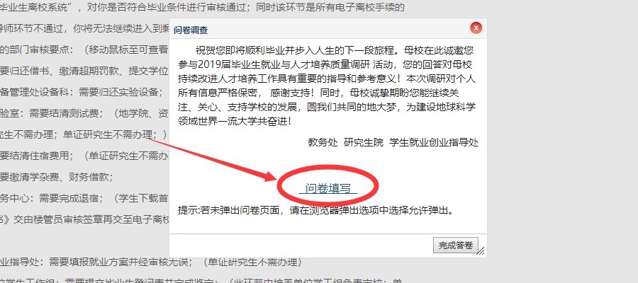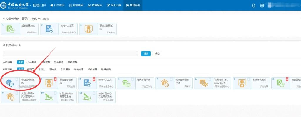 进入毕业离校环节,请各位研究生首先联系导师进行“毕业条件审核”(如果毕业生是双导师,根据研究生院学位办要求由第一导师进行离校审核),提醒导师进入“中国地质大学校园信息门户”-“毕业生离校系统”,对研究生是否符合毕业条件进行审核通过;同时该环节是研究生所有电子离校手续的前置环节,如果导师环节不通过,研究生将无法继续进入到剩下的离校环节审核。