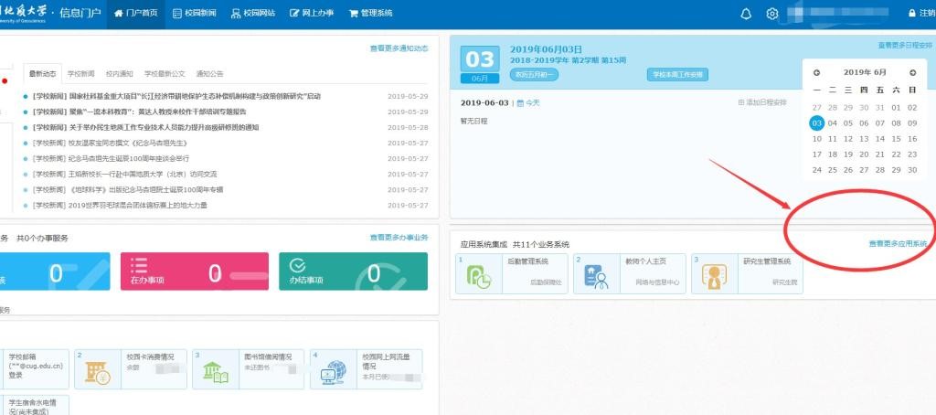 (2)点击右侧“应用系统集成”菜单栏查看“更多应用系统”,进入“毕业生离校系统”。