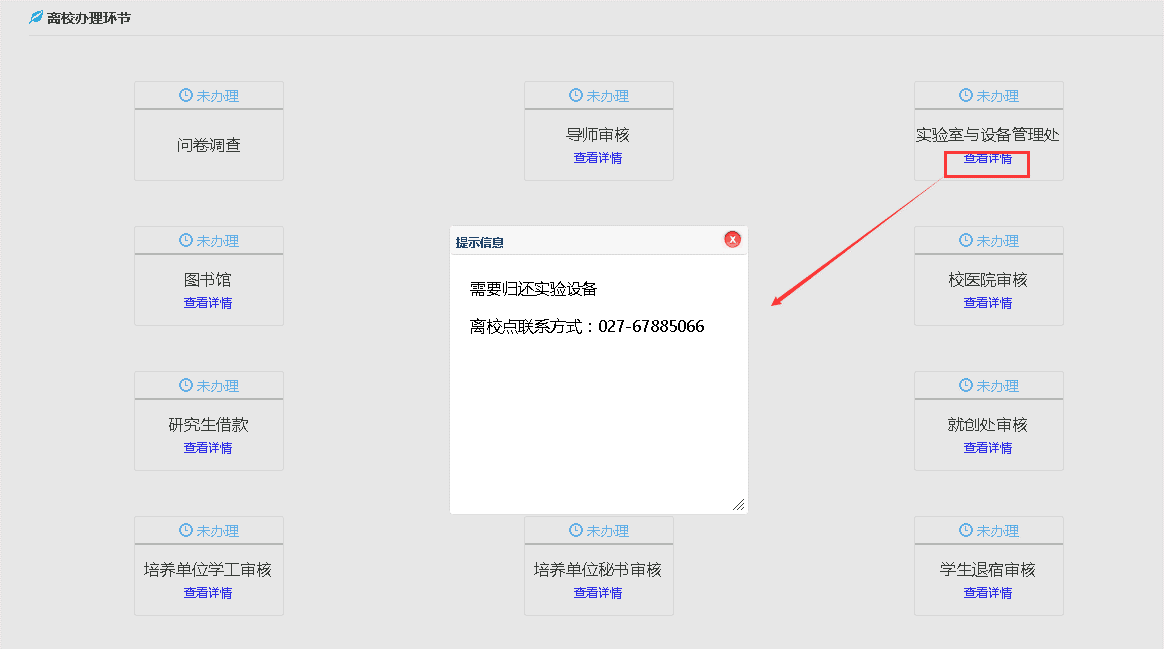 ① 本科生一共有9项、双证研究生一共有12项、单证研究生一共有6项需要办理的离校手续。请按照序号依次办理离校手续,具体可以分别点击每项毕业离校手续的“查看详情”查看不通过原因。