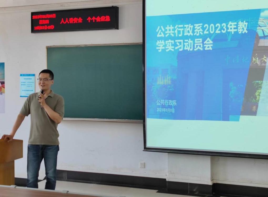 公共行政系2023年教学实习动员与安全生产布置会在北区综合楼202教室成功举行。会议由钱文强老师主持,秭归基地带队老师刘中兰老师,洪山区政府实习点带队老师黄砺老师、张士菊老师和陈星老师,以及行政管理与公共事业管理专业2021级全体本科生参加了此次会议。
