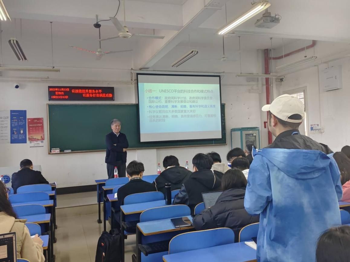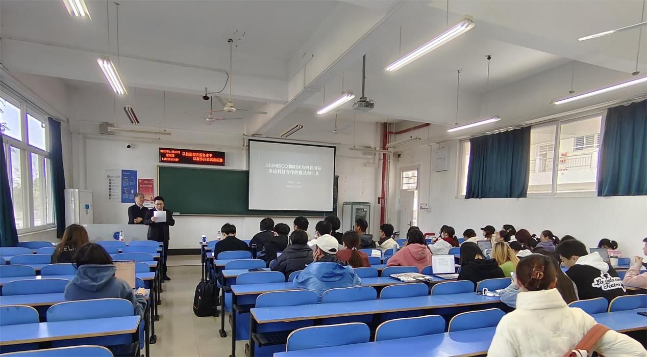 联合邀请,国际科学理事会(ISC)和联合国减灾办(UNDRR)联合发起的灾害风险研究(IRDR)国际计划办公室执行主任、中国可持续发展大数据国际研究中心特聘研究员韩群力来校讲座,并组织我校第二期“全球胜任力”人才培养工作坊。本次讲座主题为“以UNESCO和IRDR为例看国际多边科技合作的模式和工具”,学校教师代表以及部分博士生、硕士生、本科生在北区综合教学楼209聆听报告讲座。讲座由B体育官网