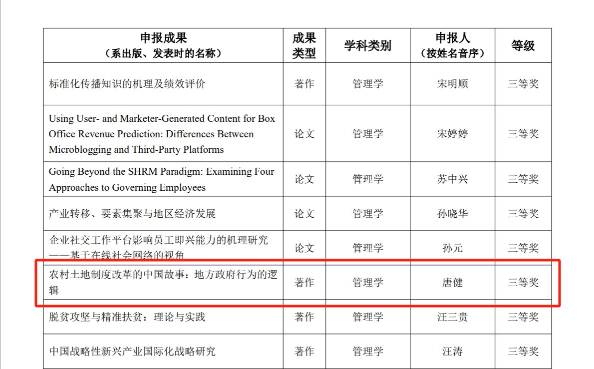 近日,《教育部关于第九届高等学校科学研究优秀成果奖(人文社会科学)奖励的决定》公布了获奖成果名单。B体育官网 唐健教授的著作《农村土地制度改革的中国故事:地方政府行为的逻辑》荣获著作论文奖三等奖,共同作者还有浙江大学的谭荣教授和中国国土勘测规划院的魏西云研究员。